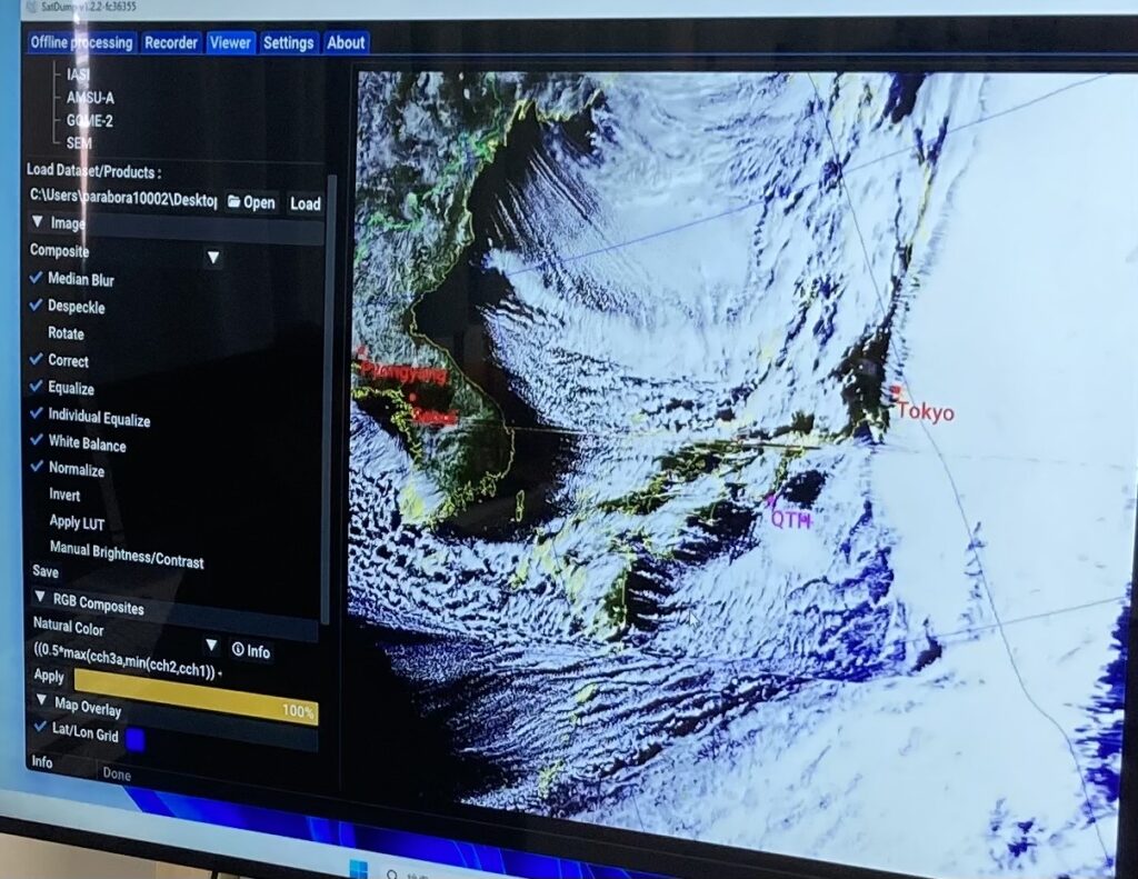 2026/01/11 「超小型衛星地上局パラボラアンテナ設置等業務」の完成 2026.01.11 和歌山県立串本古座高等学校様に設置 完成した操作室 気象衛星を追尾電波受信し、雲画像に生成するまでのシステムを構築しました。 ファーストライトは日本列島に寒波襲来! 受信日時 2026/01/11